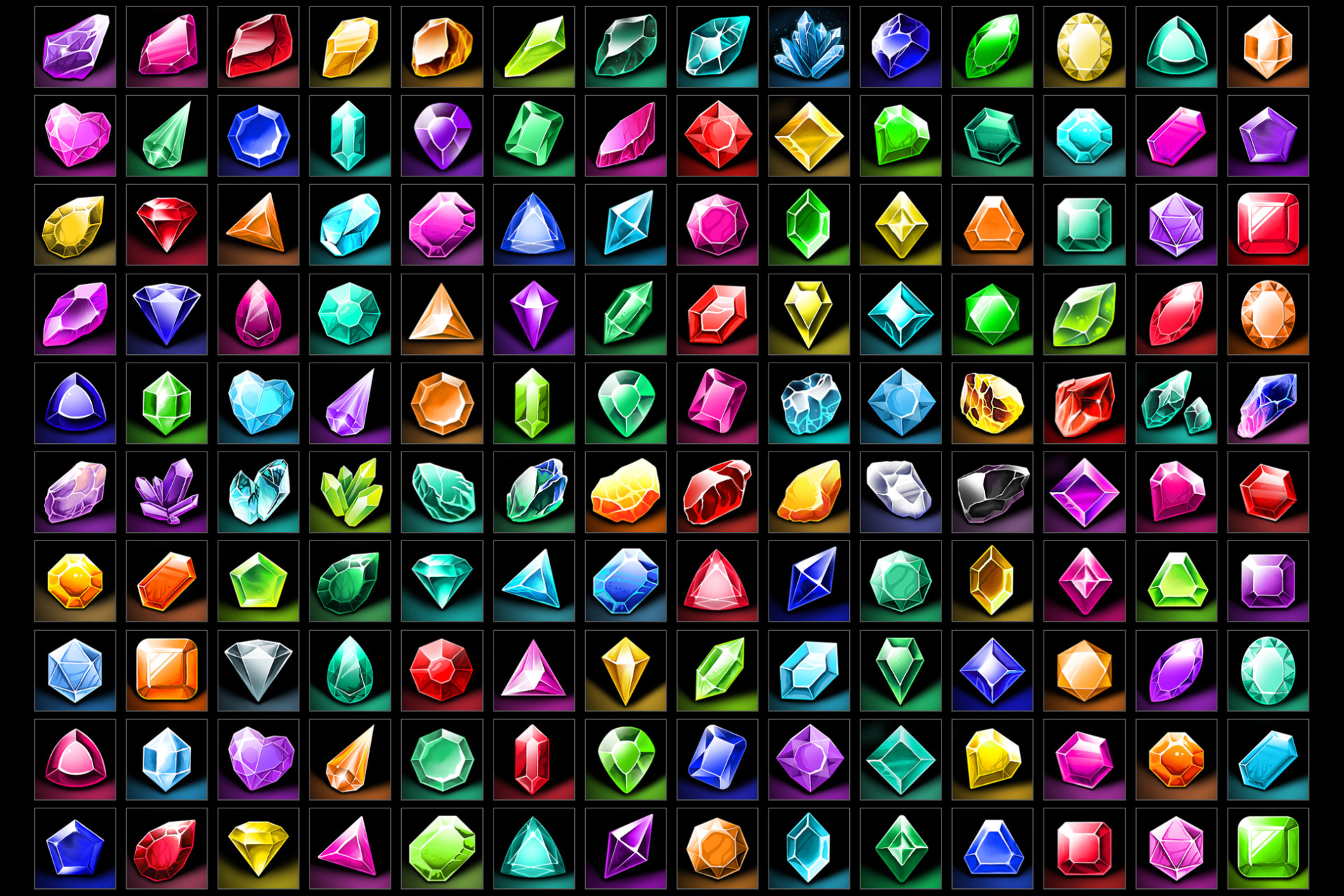 This is a pack of 150 hand-drawn icons related to gems and crystals.